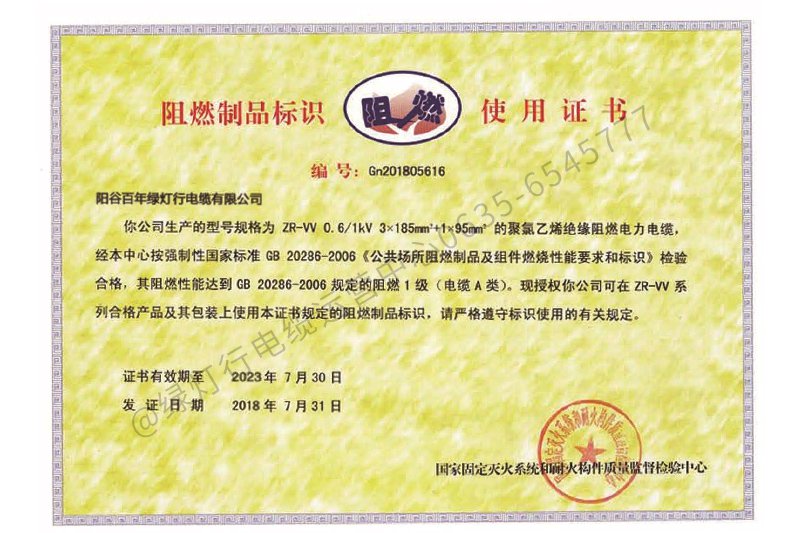 阻燃制品标识使用证书